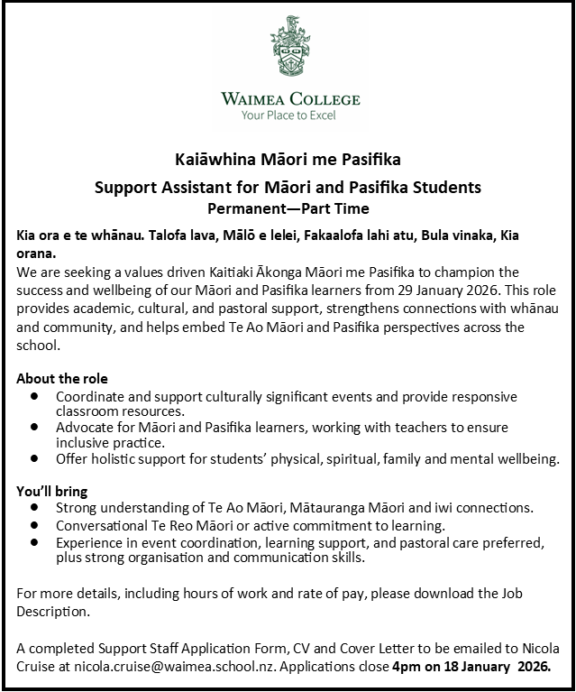 - Applications should be in the form of a CV, cover letter along with a completed official Waimea College: